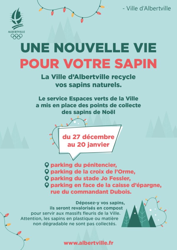 Pour la première fois, le service Espaces verts de la Ville d’Albertville met en place une collecte des sapins de Noël.La collecte se fera du 27 décembre 2024 au 20…